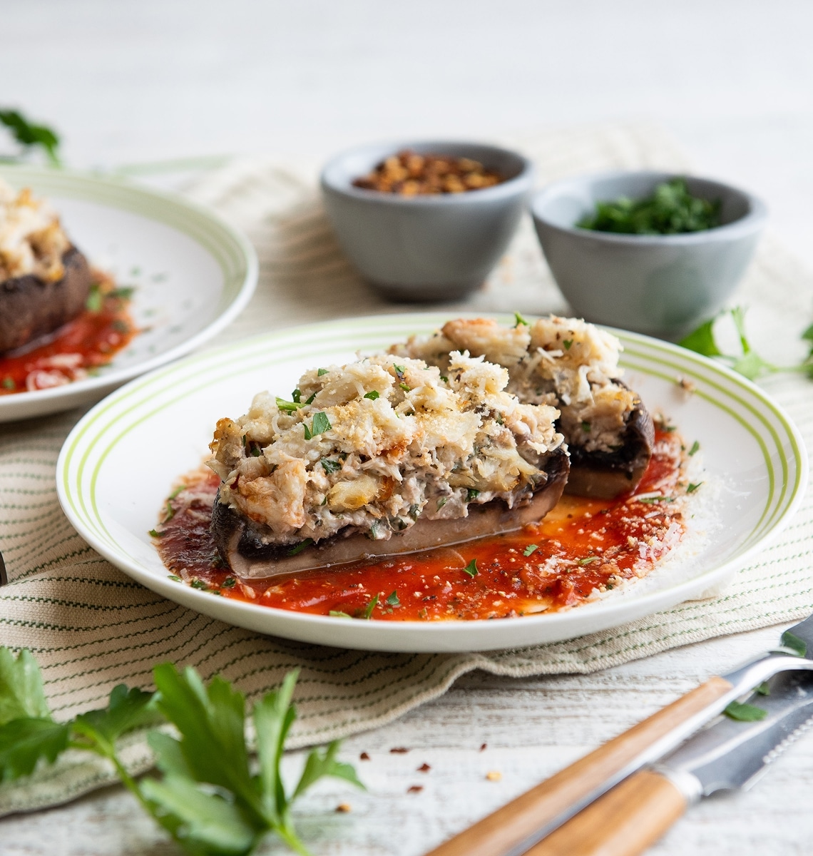 Crab Stuffed Portobello Mushrooms A scaled-up, entrée-worthy version of the classic finger food. Total Time 45 minutes Servings 4 servings Ingredients Share 1 (8 oz) cup Chicken of the Sea® Lump Crab or any other Chicken of the Sea® Refrigerated Crab 4 medium portobello mushrooms 4 medium portobello mushrooms 4 oz. cream cheese, softened 1/4 cup minced onion 1/2 teaspoon garlic powder 2 Tablespoons minced flat-leaf parsley, plus extra for topping 1 Tablespoon Worcestershire sauce 1/2 cup grated Parmesan cheese, plus extra for topping 1/2 teaspoon salt, or to taste 1/2 teaspoon black pepper 1/4 cup bread crumbs 1 cup marinara sauce Optional toppings: Parmesan cheese, minced parsley, chili flakes Instructions Pre-heat oven to 400°F. Lay foil or parchment paper on baking sheet pan. Remove mushrooms stems and chop small. In bowl combine softened cream cheese, chopped mushrooms stems, onion, garlic powder, parsley, Worcestershire sauce, Parmesan cheese, salt, and pepper. Fold in about half of the crab into the cheese mixture. Spray or brush both sides of mushrooms caps with oil. Divide the cheese mixture into the mushroom caps. Bake for about 12-18 minutes or until cheese mixture becomes warm and melty. Top mushrooms with remaining crab and the bread crumbs. Add a light oil spray over the crab and mushrooms.Bake for additional 3-5 minutes or until crab is heated through and bread crumbs are golden.While the mushrooms bake, heat the marinara sauce. For serving, spoon about 1/4 cup of the marinara on each plate. Lay stuffed mushroom on top and any optional toppings if desired (Parmesan cheese, parsley, chili flakes). In this Recipe: Blue Swimming Crab – Lump