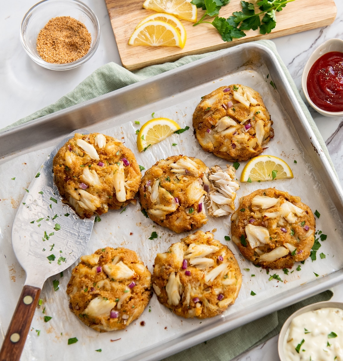 Creole Crab Cakes (Baked Version) A baked version of our Creole Crab Cakes. Total Time 20 minutes Servings 6 servings Ingredients Share 1 (8 oz) cup Chicken of the Sea® Jumbo Blend Crab or any other Chicken of the Sea® Refrigerated Crab 1 large egg, beaten 2 Tablespoons mayonnaise 1/2 cup bread crumbs 1/4 cup minced red onion 1 Tablespoon chopped fresh parsley (plus extra for garnish) 1 teaspoon Worcestershire sauce 1 teaspoon Dijon mustard 1 teaspoon creole seasoning 1/2 teaspoon smoked paprika black pepper, to taste Oil, for brushing Optional Serving: Tartar Sauce, Cocktail sauce or Lemon wedges Instructions Pre-heat oven to 425°F. Line a baking sheet pan with parchment or foil. Brush or spray prepared pan with oil. In a bowl combine eggs, mayonnaise, bread crumbs, red onion, parsley, Worcestershire sauce, mustard, creole seasoning, paprika, and black pepper. Gently fold crab into mixture. Scoop about 1/4 cup of filling and shape into flat patties. Lay patties on prepared baking sheet pan. Brush or spray tops of patties with oil. Bake for 12-15 minutes or until golden and cooked through. In this Recipe: Blue Swimming Crab – Jumbo Blend