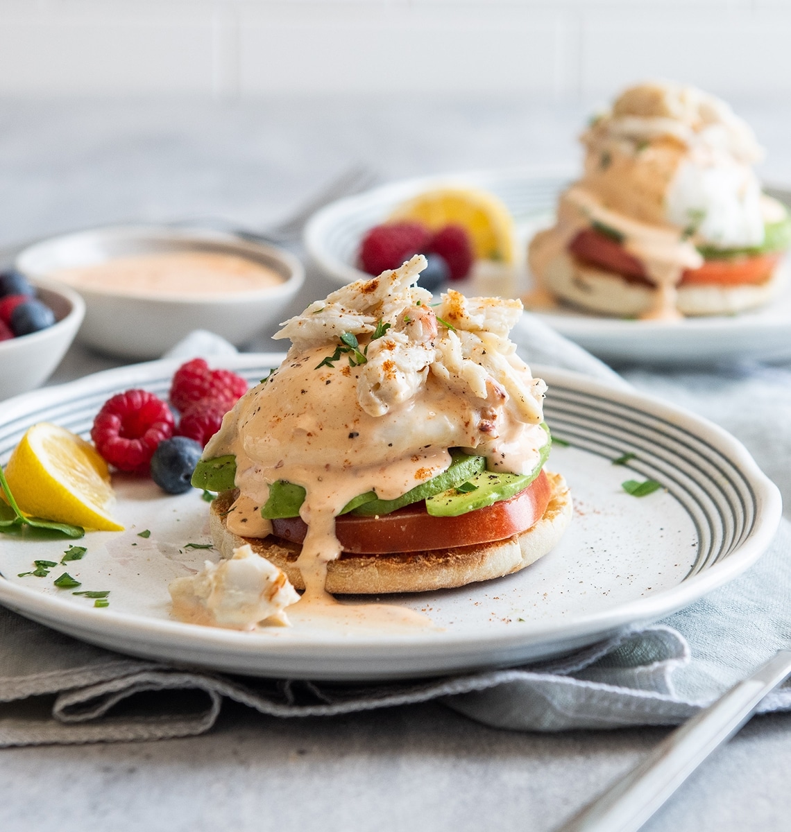 Crab Avocado Benedict Crab and avocado replace the Canadian bacon in this spicier, fresher take on Eggs Benedict. Total Time 30 minutes Servings 4 servings Ingredients Share 6-8 oz. Chicken of the Sea® Super Lump Crab or any other Chicken of the Sea® Refrigerated Crab 2 Tablespoons butter 4 poached eggs 2 English muffins, halved and toasted 1 large avocado, sliced 1 medium heirloom tomato, sliced 1 cup Hollandaise sauce 2 Tablespoons minced parsley 1 teaspoon smoked paprika Salt, to taste black pepper, to taste Instructions Melt butter in pan, add crab and sauté for 3-5 minutes until crab is warm. On toasted English muffin half, add tomato, 1/4 avocado, poached egg and 1/4 cup of hollandaise sauce. Top with crab, parsley and smoked paprika. Repeat for remaining benedicts. Season with salt and pepper, to taste. In this Recipe: Blue Swimming Crab – Super Lump