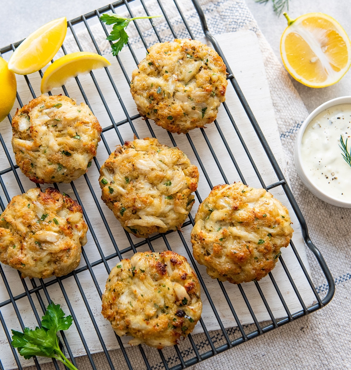 Traditional Crab Cakes (Baked Version) A baked version of our Traditional Crab Cakes. Total Time 30 minutes Servings 6 servings Ingredients Share 1 (8 oz) cup Chicken of the Sea® Lump Crab or any other Chicken of the Sea® Refrigerated Crab 2 large eggs, beaten 1/2 cup bread crumbs 1 Tablespoon chopped fresh parsley 1 teaspoon Dijon mustard 1 teaspoon Worcestershire sauce 1 teaspoon seafood seasoning Oil, for brushing Instructions Pre-heat oven to 425°F. Line a baking sheet pan with parchment or foil. Brush or spray prepared pan with oil. Combine eggs, bread crumbs, parsley, mustard, Worcestershire sauce, and seafood seasoning. Gently fold crab into mixture. Scoop about 1/4 cup of filling and shape into flat patties.Lay patties on prepared baking sheet pan. Brush or spray tops of patties with oil. Bake for 12-15 minutes or until golden and cooked through. In this Recipe: Blue Swimming Crab – Lump