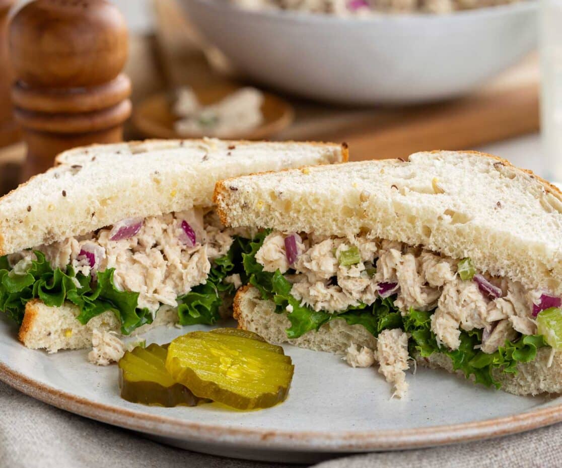 Tuna Sandwich Recipe Make the ultimate tuna sandwich with this easy recipe featuring wild caught tuna. It’s a high-protein, delicious, and classic lunch solution ready in just minutes! Share What’s the best way to make a classic tuna sandwich? A classic tuna salad sandwich is made by combining flaked, wild caught canned tuna with creamy mayonnaise, crunchy onions or celery, and tangy seasonings, served between slices of high-quality bread. To achieve the perfect balance of flavor and texture, use a 2:1 ratio of tuna to crunch (like celery and onion) and choose a sturdy bread that can support the filling without becoming soggy. Prep Time 15 minutes Total Time 15 minutes Servings 4 servings Table of Contents Recipe Ingredients Ingredient Notes Step-by-Step Instructions Recipe Tips & Variations Frequently Asked Questions Nutrition Facts Recipe Reviews What ingredients do you need for a tuna sandwich? The secret to an elite tuna sandwich lies in the quality of your pantry staples and the freshness of your produce. While the tuna is the star, the supporting ingredients provide the essential crunch and “zing” that define this classic meal. What are the core tuna sandwich ingredients? To make 4 tuna salad sandwiches, you’ll need: Tuna: 2 (5 oz) cans or packets of wild caught tuna (Albacore or Light), thoroughly drained. Bread: 8 slices of bread (Sourdough, Whole Grain, or Brioche). Lettuce: 4-8 leaves of lettuce (Bibb, butter, or Romaine) Mayonnaise: ¼ cup of high-quality mayonnaise to act as the binder. The Crunch: 2 tablespoons each of minced celery and minced red onion. The Acid: 1–2 teaspoons sweet pickle relish and a squeeze of fresh lemon juice. Seasonings: 2 teaspoons whole-grain or Dijon mustard, 1 teaspoon minced flat-leaf parsley, salt, and black pepper to taste. Optional Savory Boost: 1 teaspoon minced garlic. How do I choose the right bread? Why it WorksBest ForSourdoughTangy flavor and sturdy crust.The classic “Deli-Style” experience.Whole GrainHearty texture and nutty notes.A healthy, protein-packed lunch.BriocheSoft, buttery, and slightly sweet.A more indulgent, rich sandwich.RyeBold, earthy flavor.Pairing with spicy mustard or kraut. How do you make a tuna sandwich step-by-step? How do I prepare the vegetables? Mellow the Onions: Fill a small bowl with cold water, add the minced red onion, and let soak for 5 minutes to remove the harsh “bite.” Dry Thoroughly: Drain the onions and pat them dry on paper towels to ensure no excess moisture enters the salad. How do I mix the tuna filling? Combine the Base: In a medium bowl, whisk together the mayonnaise, mustard, celery, red onion, parsley, and relish. Fold in the Tuna: Add your drained Chicken of the Sea tuna to the bowl. Stir gently to combine, keeping some texture in the tuna flakes. Season: Add salt, pepper, and a squeeze of lemon juice to taste. How do I assemble the sandwich? Protect the Bread: For the best results, lightly toast your bread. Spread a thin layer of butter or mayo on the bread and a leaf of lettuce to create a moisture barrier. Layer: Scoop a generous portion of the tuna mixture onto four slices of sandwich bread, then top with the remaining slices. Serve: Slice diagonally and enjoy immediately. Serves 4. What are the best tips for a better tuna sandwich? Small adjustments in preparation and ingredient choice can transform a basic lunch into a gourmet meal. These professional tips focus on texture control and flavor depth. How do I keep my sandwich from getting soggy? To prevent a soggy sandwich, always drain your canned tuna thoroughly. If using tuna packed in oil, pat the fish with a paper towel to remove excess oil before mixing. Additionally, placing a leaf of lettuce between the toasted bread and the tuna mixture acts as a natural “shield.” Can I customize the flavor? Add Heat: Stir in diced, de-seeded jalapeños for a spicy kick. Swap Herbs: Use fresh dill, chives, or basil instead of parsley for a different aromatic profile. Fruit Accents: Add finely minced apple or grapes for a sweet contrast to the savory tuna. Tuna Melt: To transform your meal into a classic tuna melt, top the tuna mixture with a slice of sharp cheddar or Swiss cheese and heat the sandwich in a buttered skillet or under a broiler until the cheese is fully melted and the bread is toasted and golden. Dill Pickles: To achieve a more savory and briny flavor profile, substitute the sweet relish with finely chopped dill pickles, which provide a sharp vinegar-based crunch that cuts through the creaminess of the dressing. Bibb, butter, or crisp Romaine lettuce are the best choices because their broad, sturdy leaves create a reliable moisture barrier that protects the bread from the tuna filling. Where to Buy This tuna sandwich recipe uses canned tuna. Use our product locator to find Chicken of the Sea canned tuna online or in a store near you. Products Buy Now Buy Now Buy Now Frequently Asked Questions about Tuna Sandwiches Common questions regarding tuna sandwiches often revolve around dietary substitutions and storage safety. Here are the authoritative answers to the most searched queries. What can I use instead of mayo? If you want to skip the mayonnaise, thick Greek yogurt or sour cream are excellent creamy substitutes. For a dairy-free, Mediterranean-style sandwich, use a high-quality extra-virgin olive oil or your favorite vinaigrette to bind the ingredients. Is it safe to use tuna packed in oil? Yes, tuna packed in oil is perfectly safe and often preferred for its richer flavor. When using oil-packed tuna, you may want to reduce the amount of mayonnaise in the recipe to maintain the proper consistency. Can I make this with canned salmon? Absolutely. Canned salmon is a great alternative that provides a rich, mild flavor and pairs perfectly with the same celery, onion, and mustard components used in a tuna sandwich. Nutrition Facts A tuna sandwich made with Chicken of the Sea wild caught tuna is a high-protein, sa